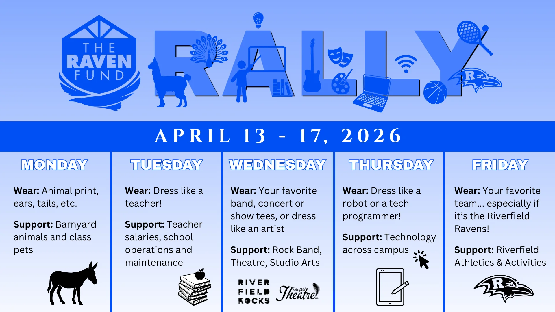 April 13-17, students are dressing up each day to celebrate the people and programs that make Riverfield exceptional!
